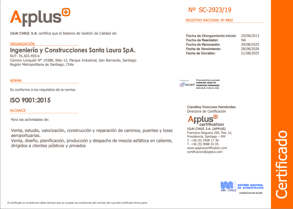 – Ingeniería y Construcciones Santa Laura SpA posee un Sistema de Gestión de la Calidad de acuerdo a la Norma ISO 9001:2015 Certificado por LGAI Chile S.A.